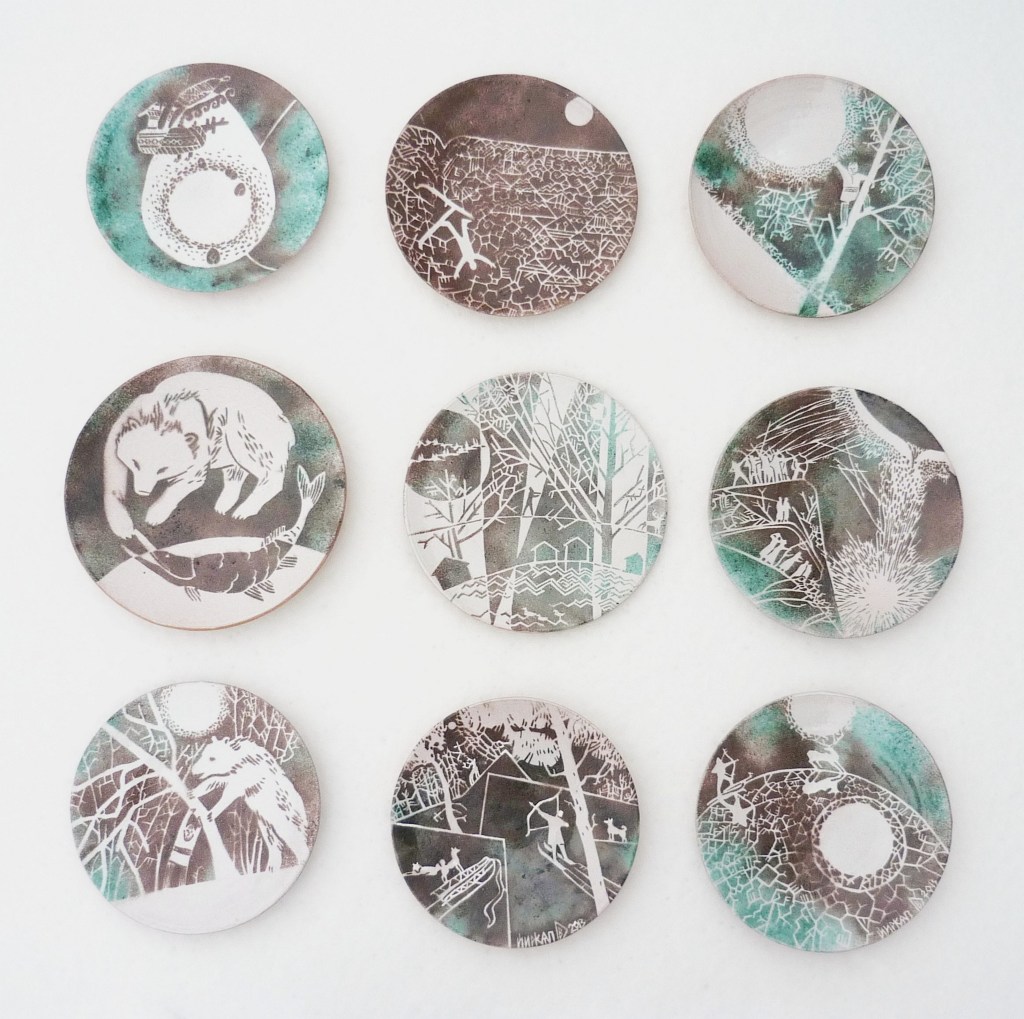 The “Fairytales of Komi” series consists of nine ceramic plates depicting little-known legends of the Komi people. Its purpose is to bring awareness to the ancient culture of the Komi ancestors among the Komi citizens. Each plate communicates meaningfully and rhythmically with the others, forming a cohesive composition. The central narrative revolves around the mythological hunter Yirkap, a reflection of the ancient ideal of an accomplished hunter, considering hunting as the primary occupation in Northern Russia during ancient times.